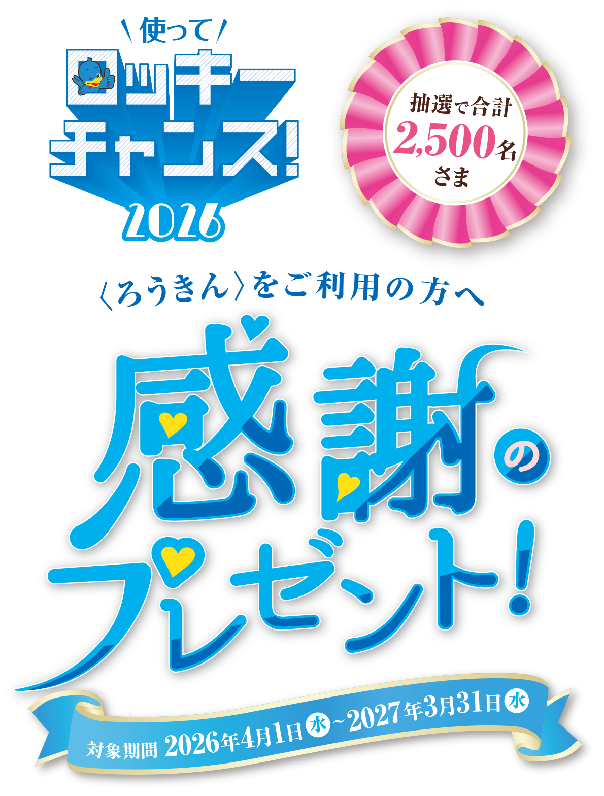 当選者の発表は、賞品の発送または普通預金口座への入金をもって代えさせていただきます。